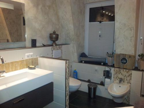 Traumbad mit begehbarer Dusche, gr.Waschtisch, Badewanne für 2, Bidet, WC und Fußbodenheizung ;-)